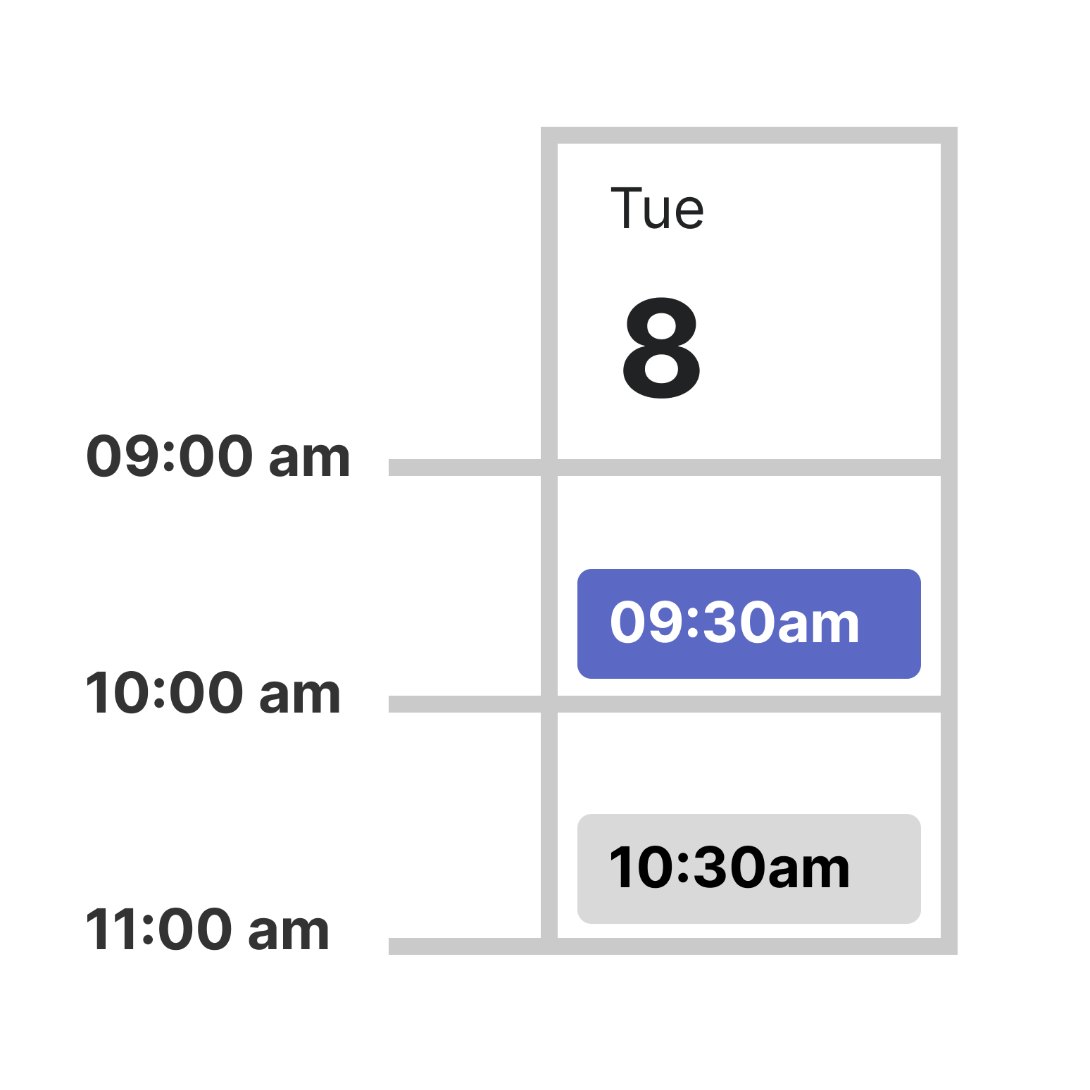 This is our most neutral booking experience with a calendar that feels and works like your personal calendar. Showing dates and times as if you are browsing your own calendar on your phone!