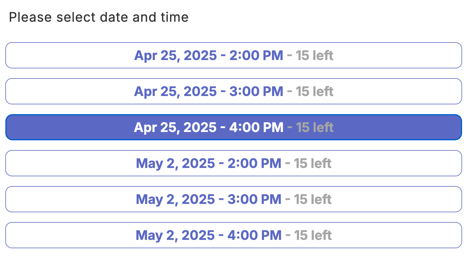 For very low-frequent available times on the calendar - like a couple of openings per month or per a few month - why bothering your customers to click through weeks and moths to find a time to book? This experience queries Sesami API for the next three months (adjustable and configurable) and show only the next available slots. Great for events or very specialty services. This is fully customizable (colors, layout, form, etc), as an SDK calendar being created from scratch for you.